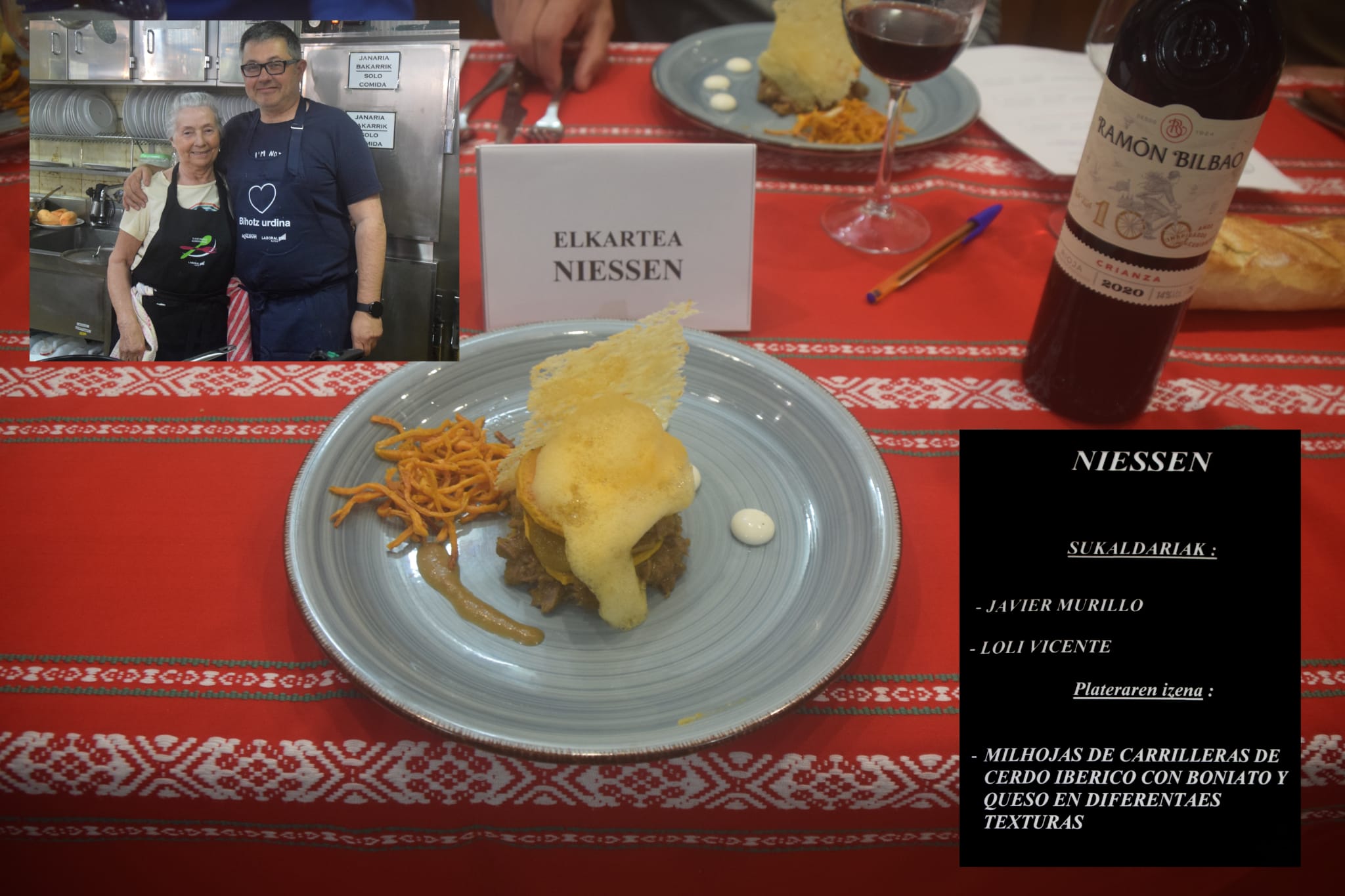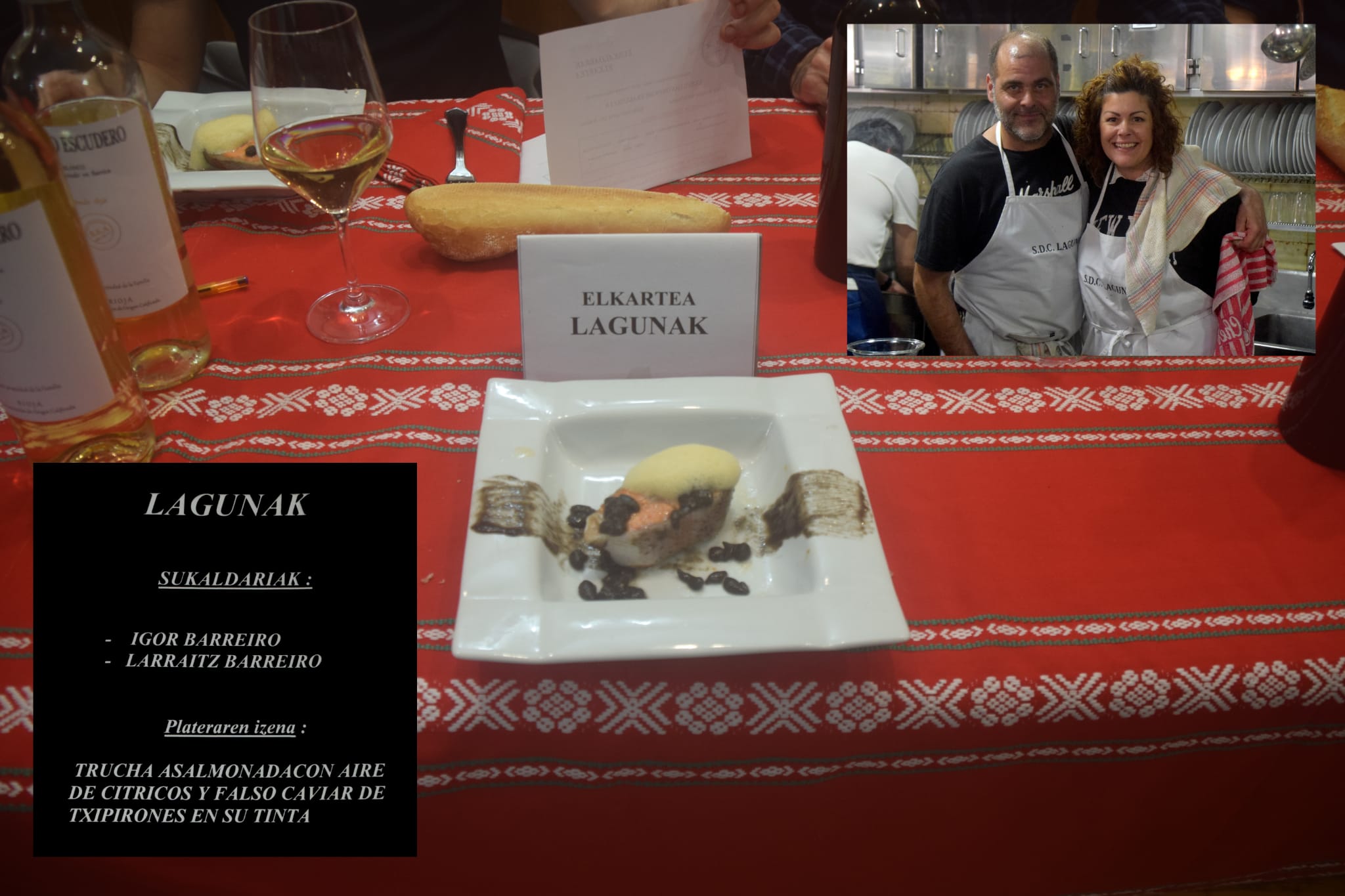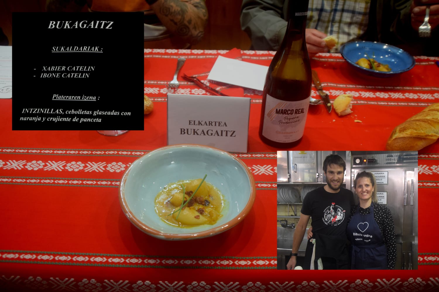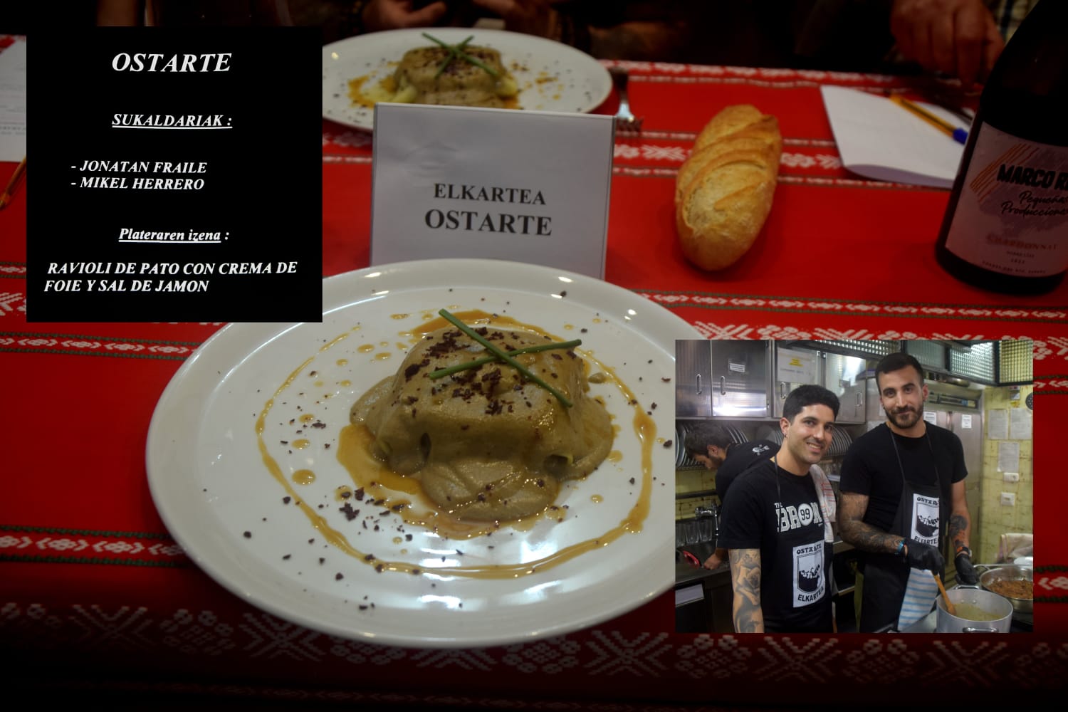 Desde la sociedad Bukagaitz, el equipo conformado por Xabier e Ibone Catelín preparó un plato de intzinillas, cebolletas glaseadas con naranja y crujiente de panceta. También participaron Alfredo Viaña y Juantxo Arregi, de Landare, pareja que cocinó un plato de manitas de cerdo con cebolla, puerro, foie, pimientos de piquillo, mermelada de hijo, huevos y arina; y también a Jonatan Fraile y Mikel Herrero, de Ostarte, con su degustación de ravioli de pato con crema de foie y sal de jamón. Los chefs Xabier Zabaleta del restaurante Aratz, Alex Barcenilla del Ziaboga,Felix Manso y Rafa Gorrotxategi se encargaron de evaluar el trabajo de los cocineros.